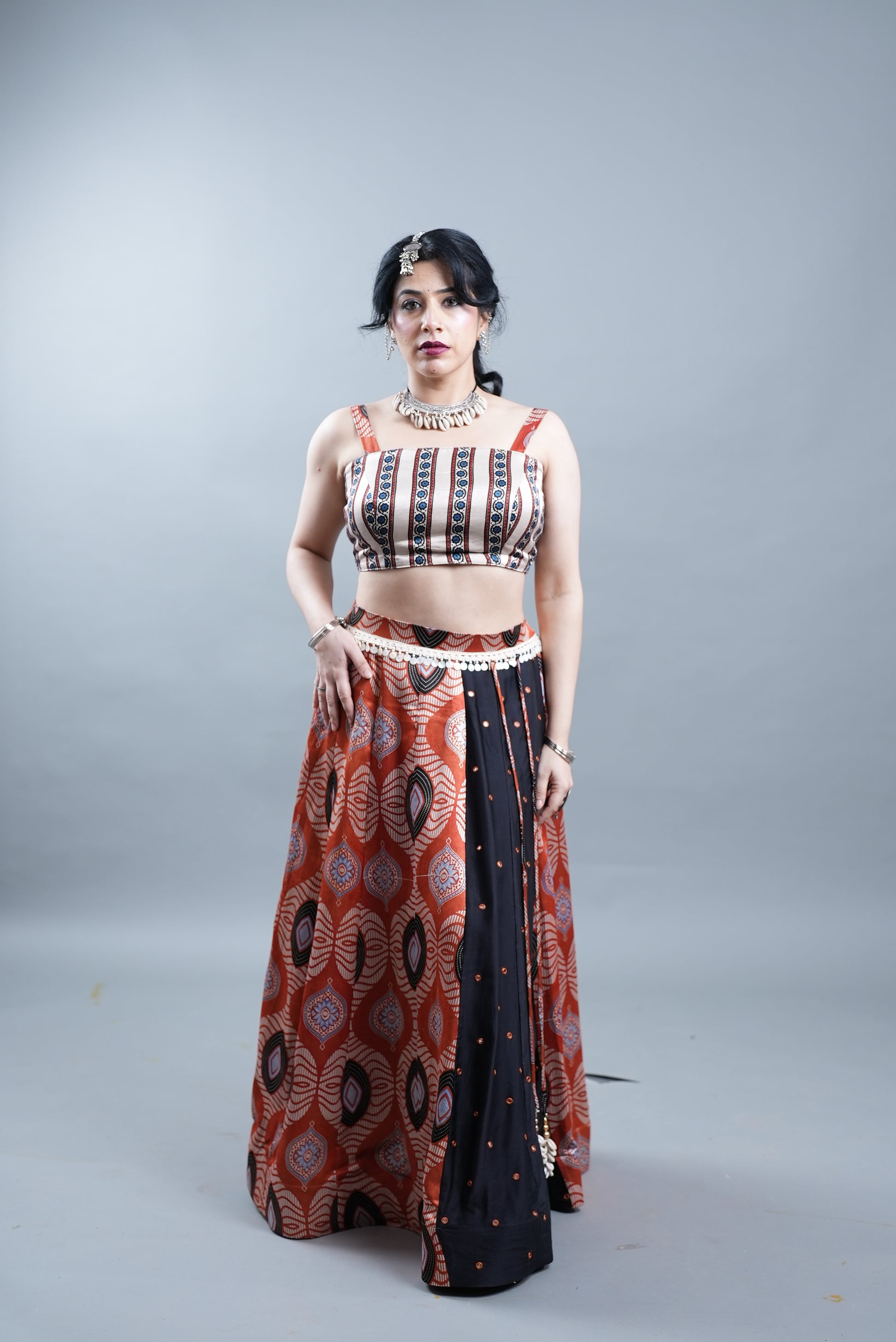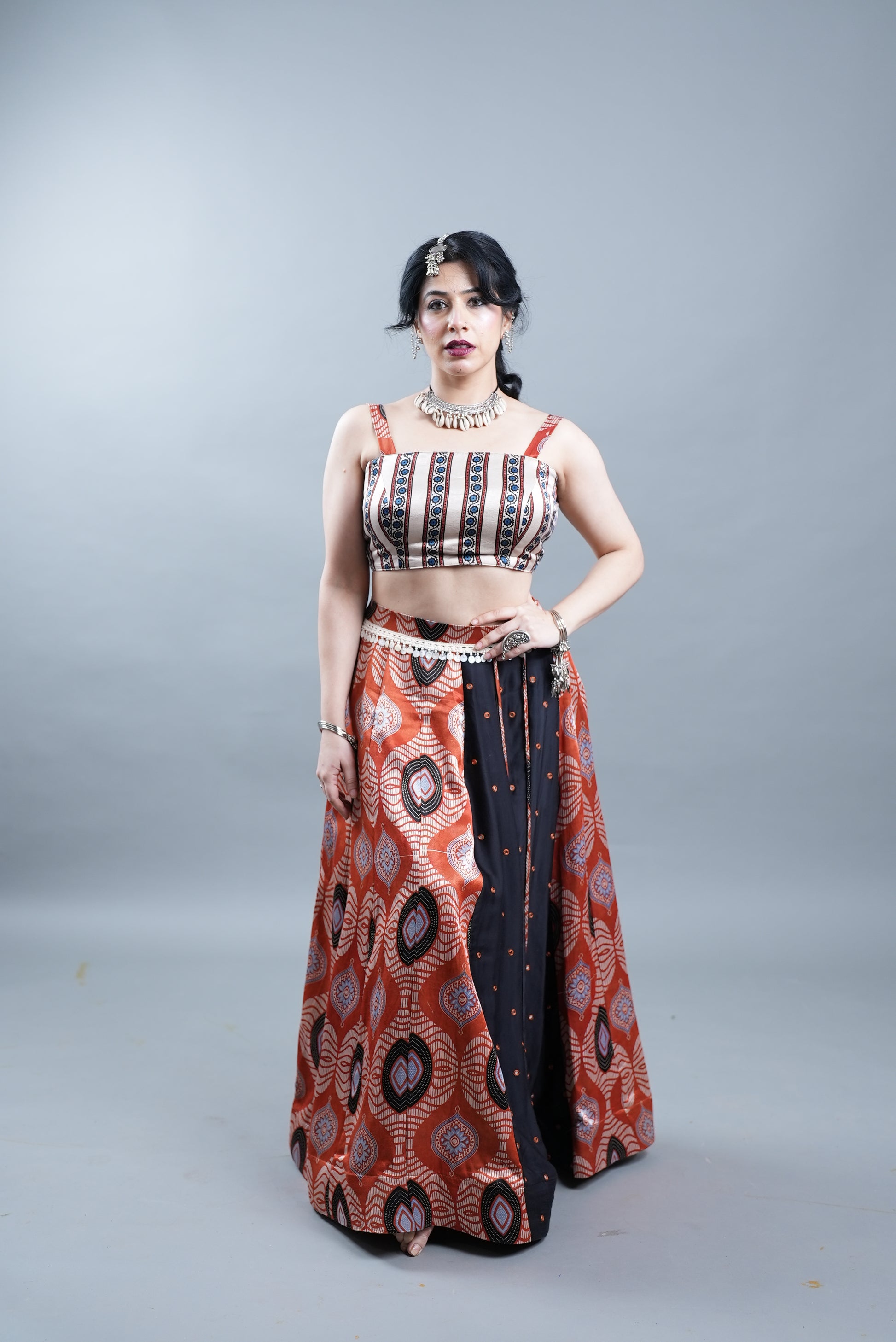 Ajrak Print 2 Piece Lehenga in Modal Silk - Orange