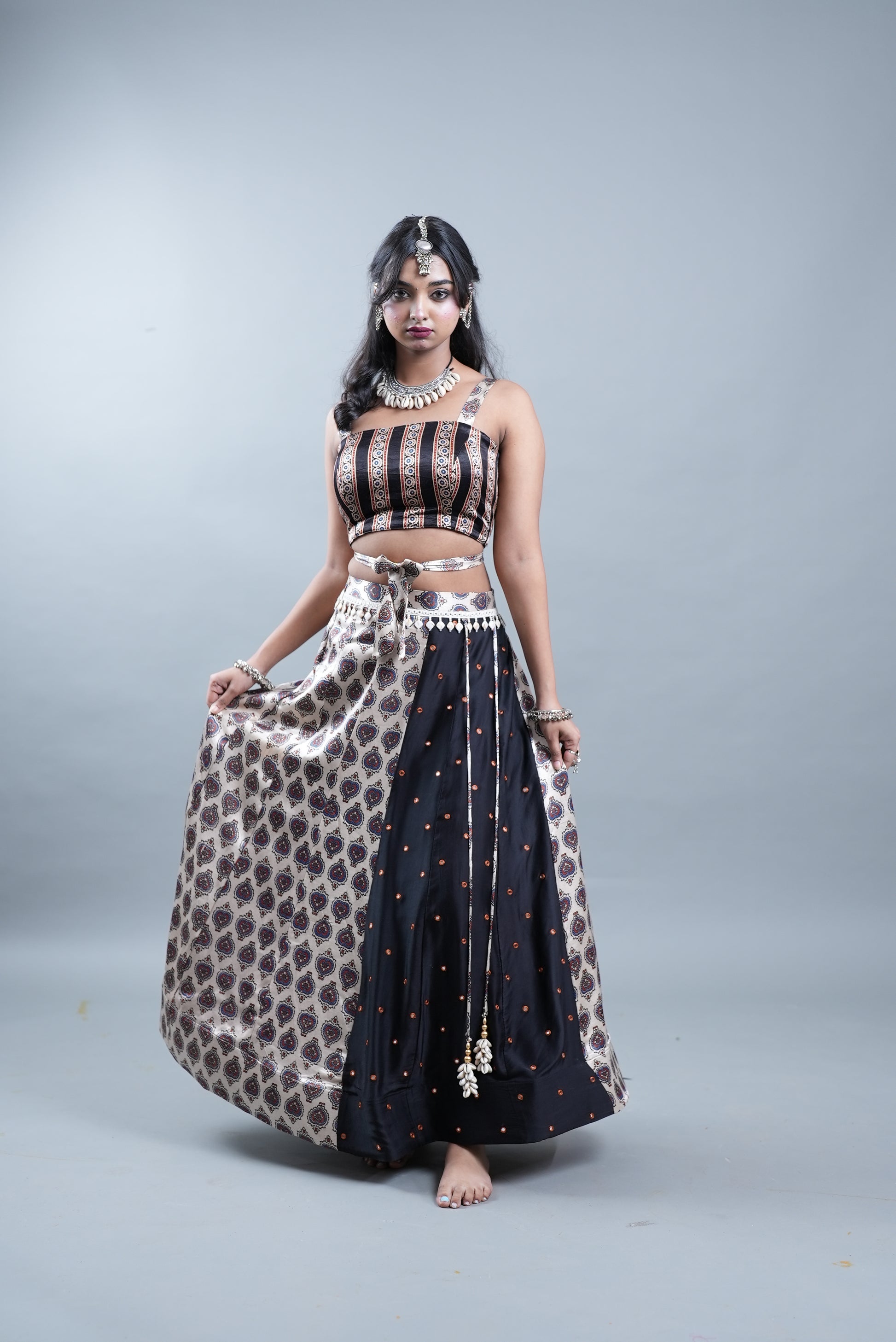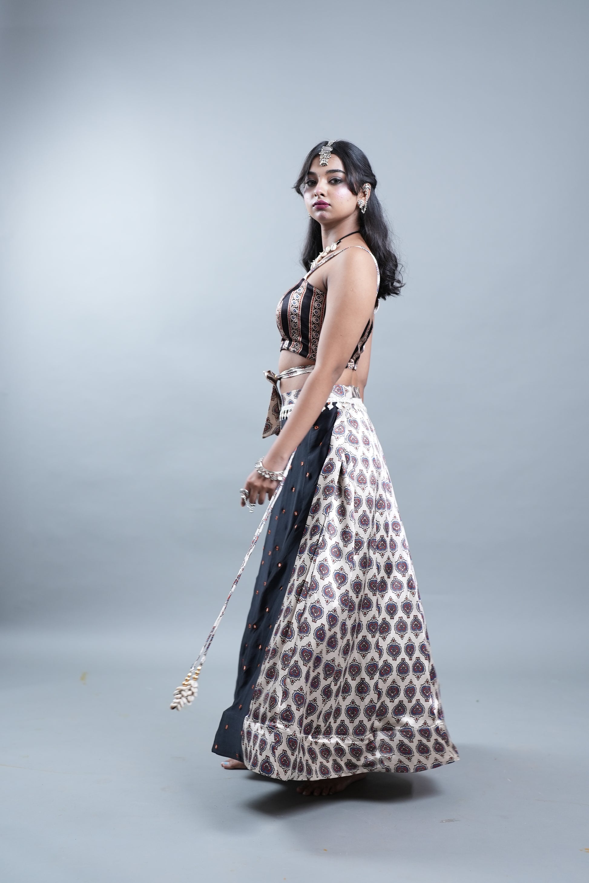 Ajrak Print 2 Piece Lehenga in Modal Silk - Silver