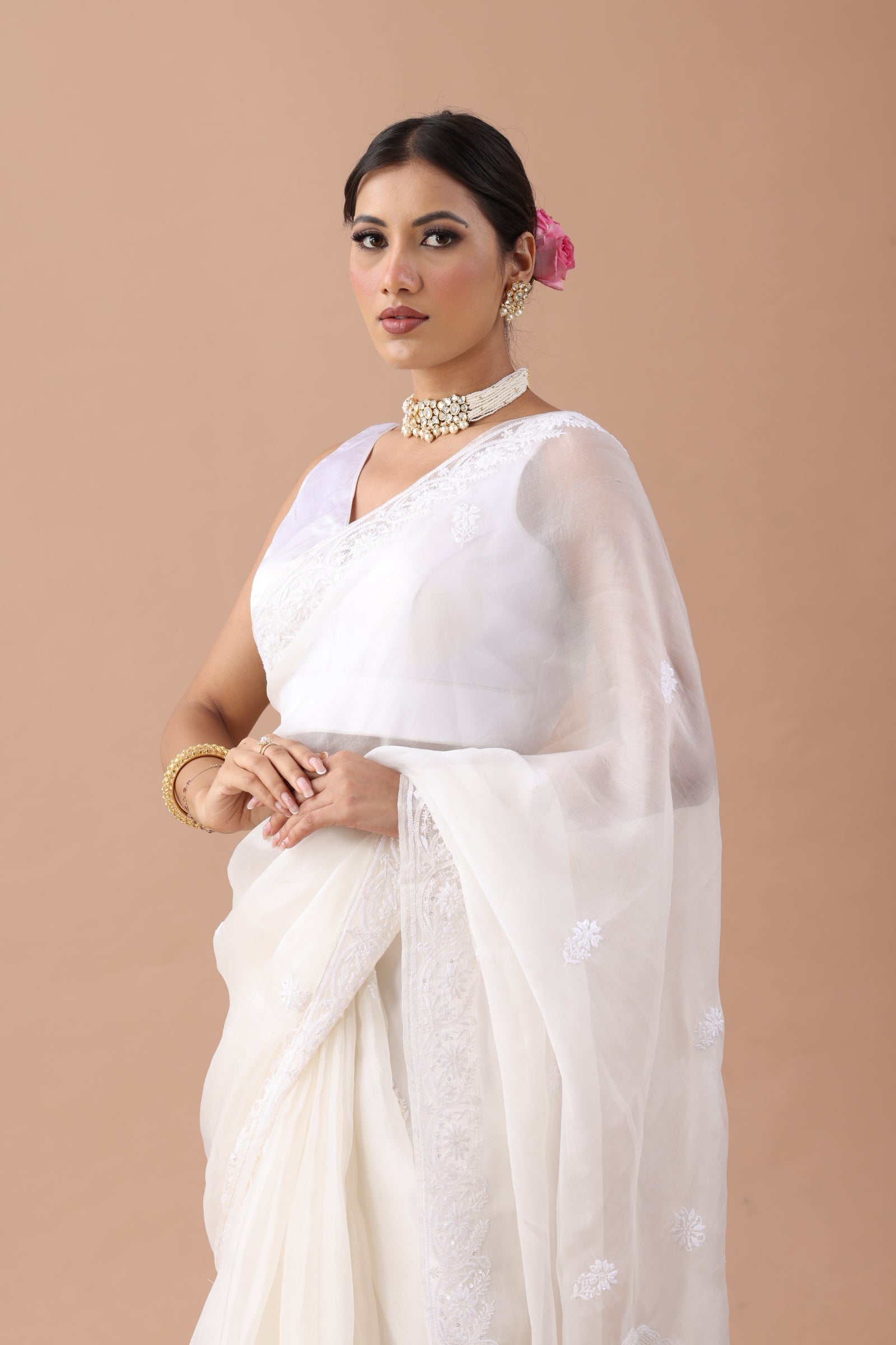 Exquisite Organza Silk Saree with intricate Chikankari handwork, delicately crafted with fine thread, Aari handwork, and highlighted with pearls, sequins, and kutdana.
