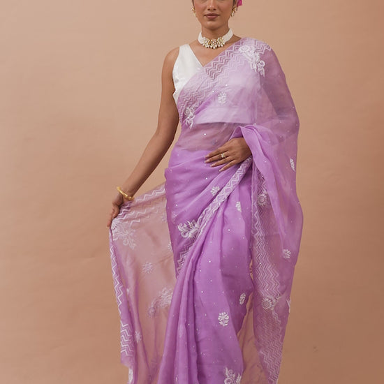 Aprajita Pure Organza Silk Chikankari Lilac Saree