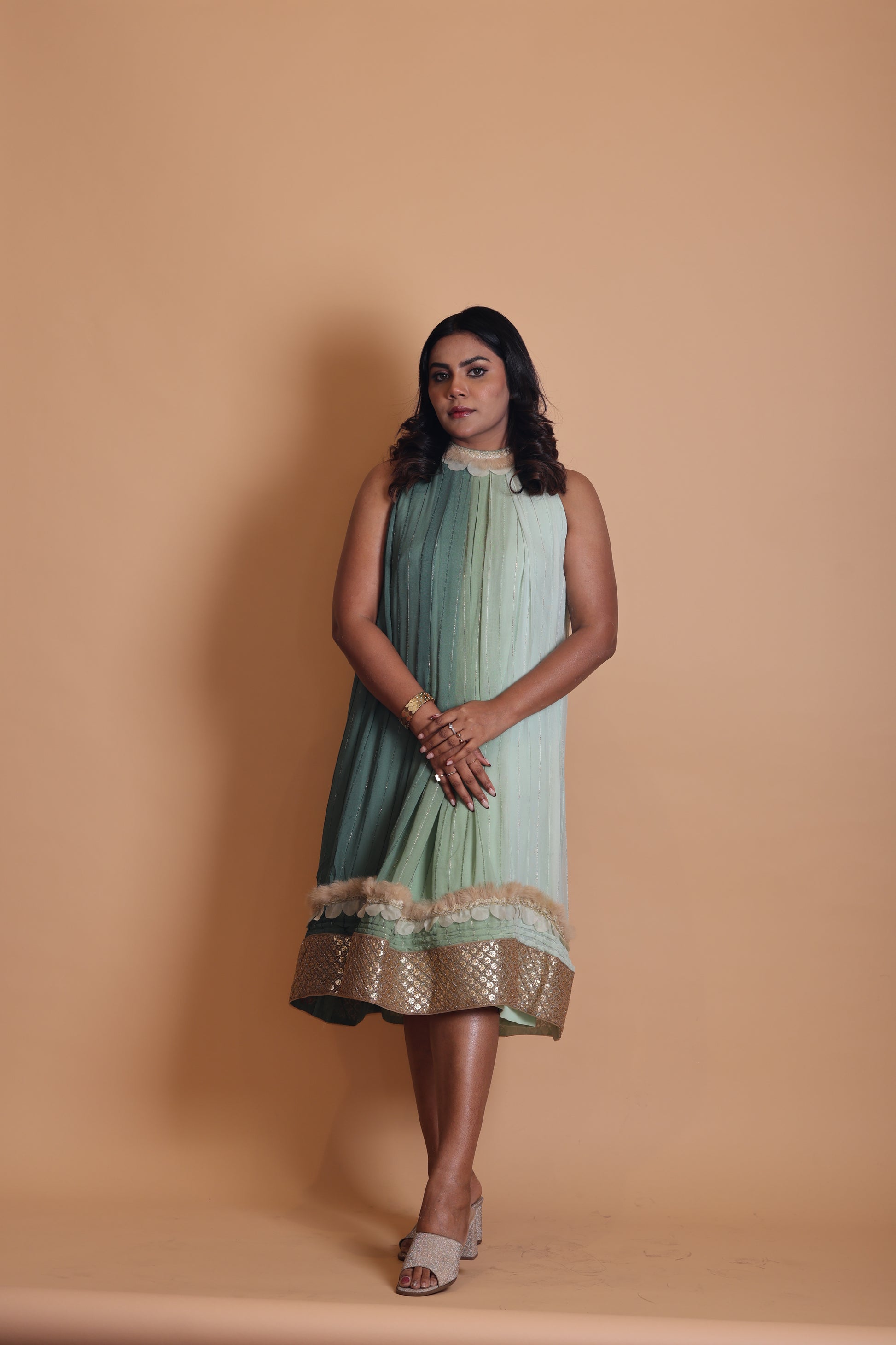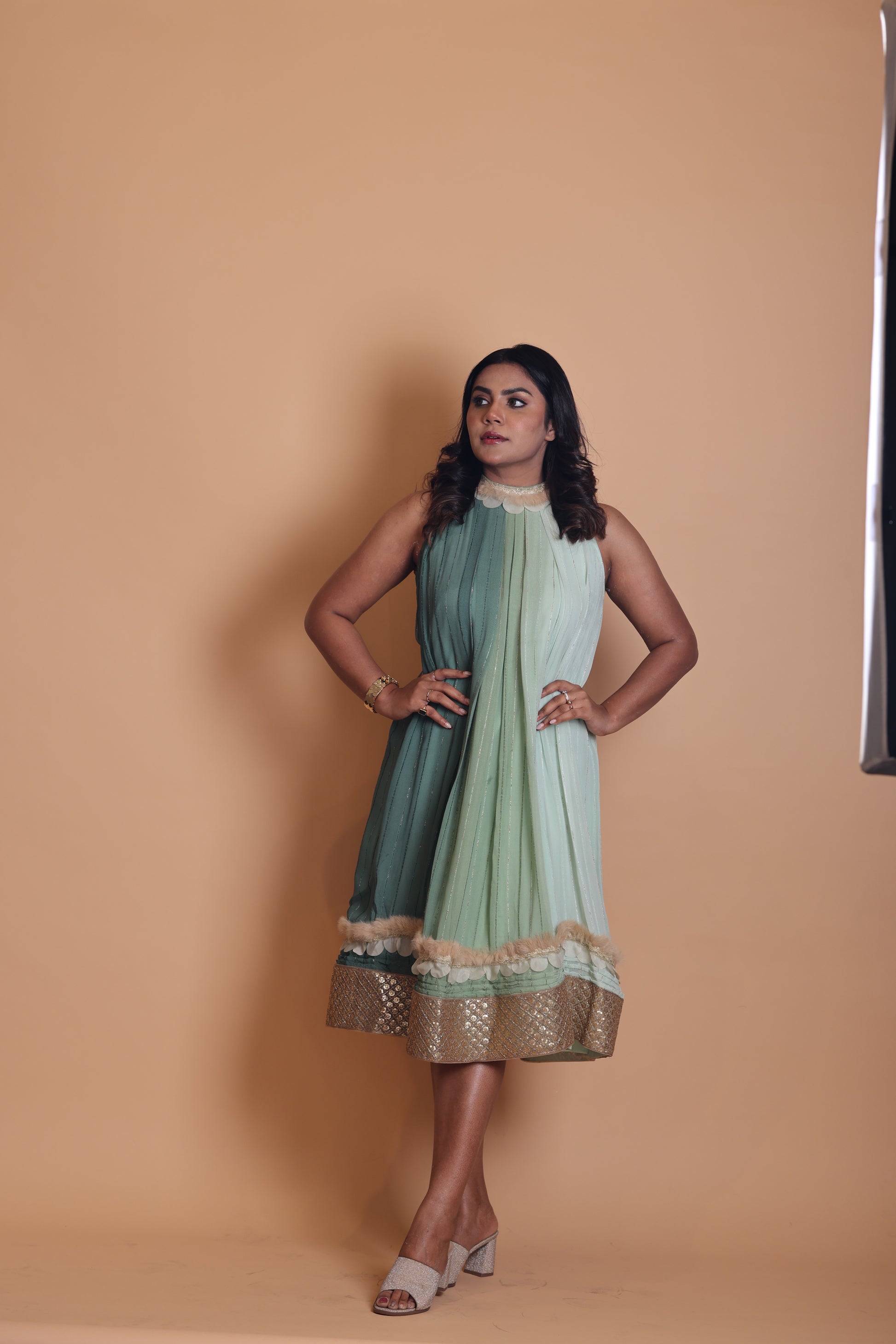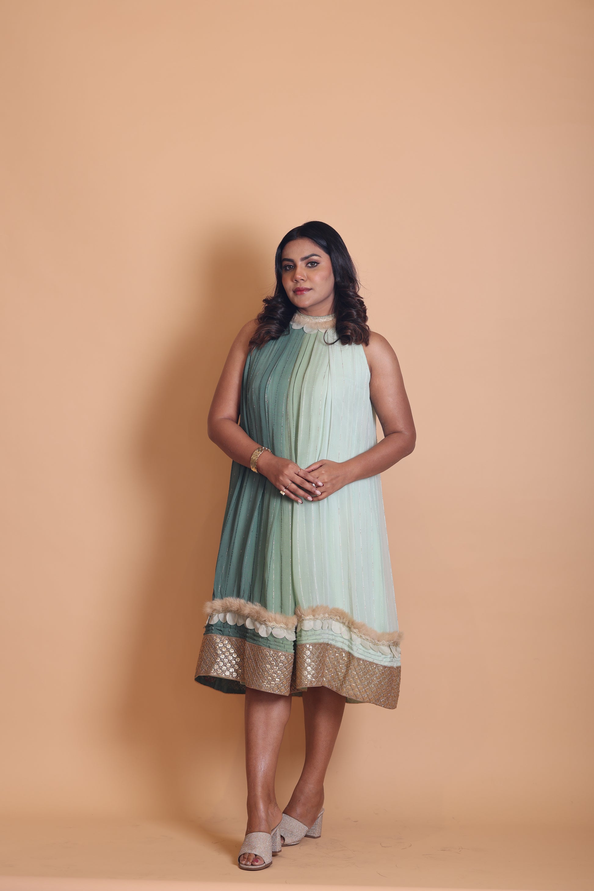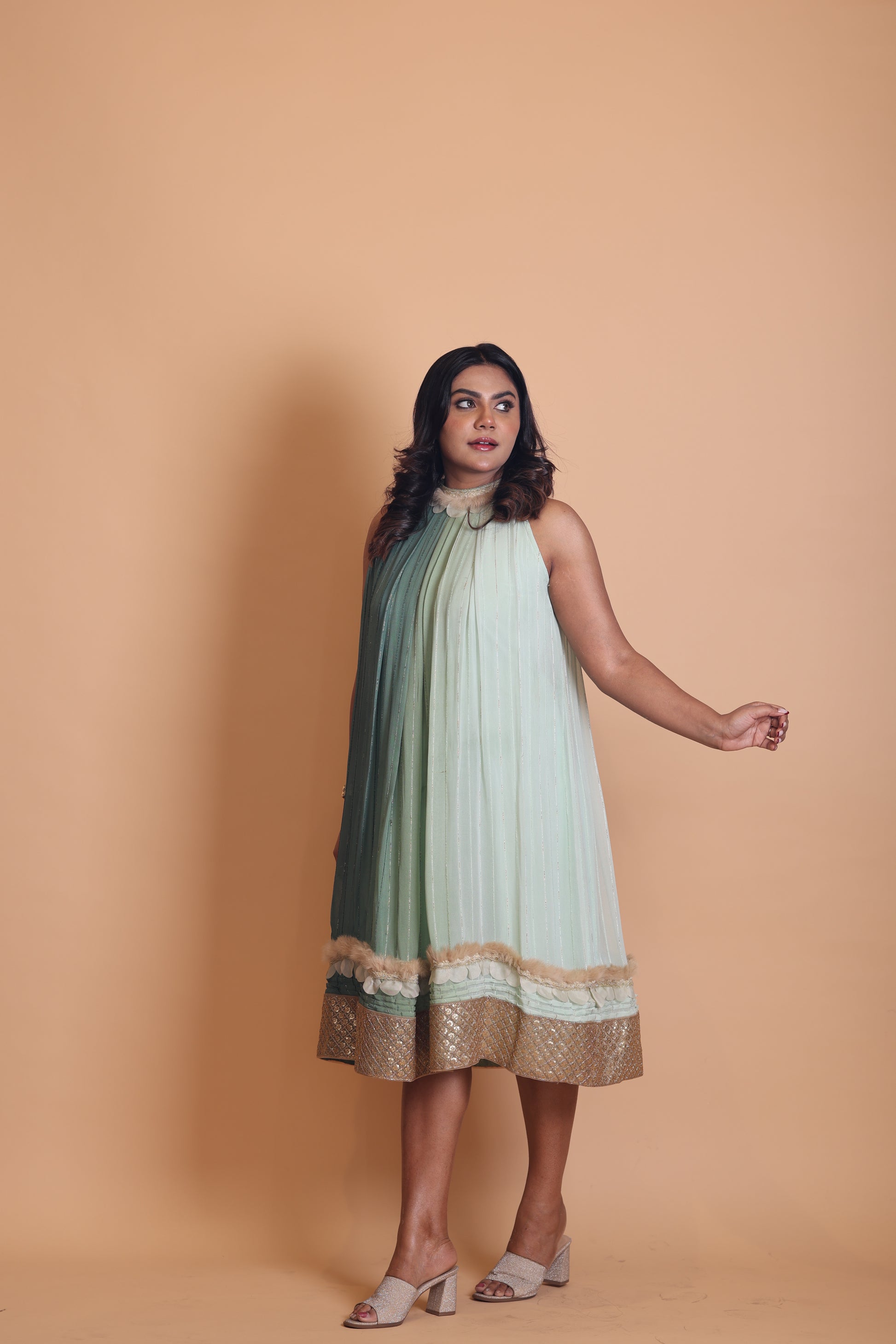 Halter Neck Pleated Knee-Length One Piece Dress in Olive Green Ombre