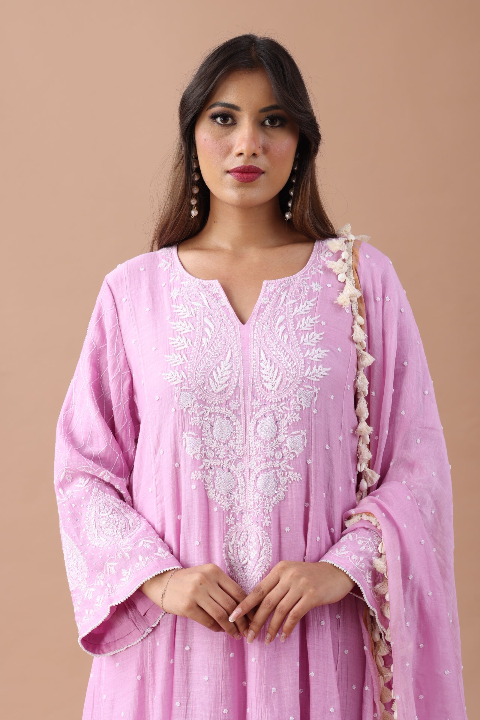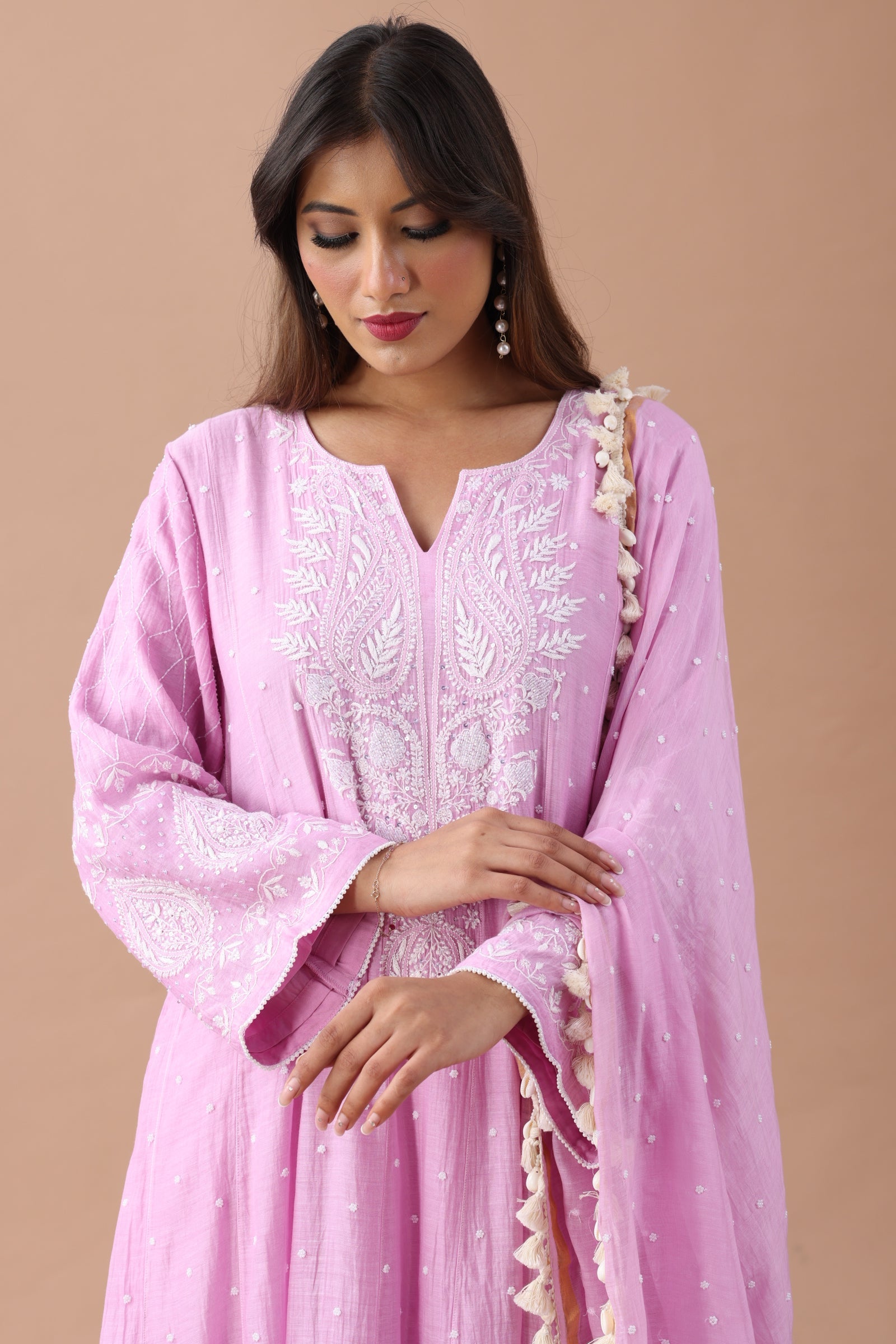 Handloom Mul Chanderi Kurta and Dupatta : Luxurious fabric with intricate thread work and pearls.