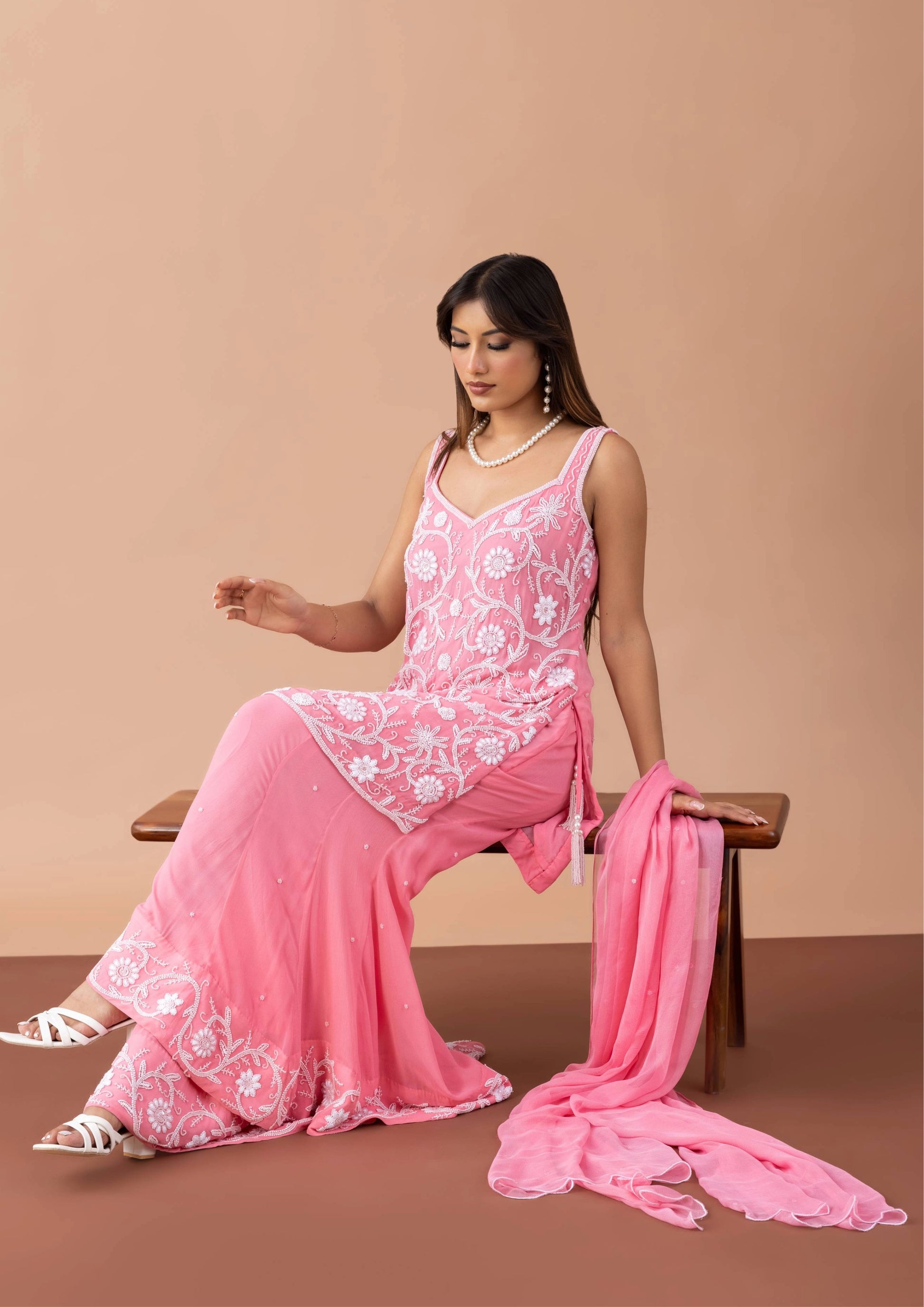 This elegant Moti Dhaga Georgette Sharara Set combines a comfortable georgette kurti and sharara with a lightweight chiffon dupatta. Adorned with delicate hand-applied moti and intricate thread work, it offers refined craftsmanship and a sophisticated look, perfect for festive occasions and special gatherings.