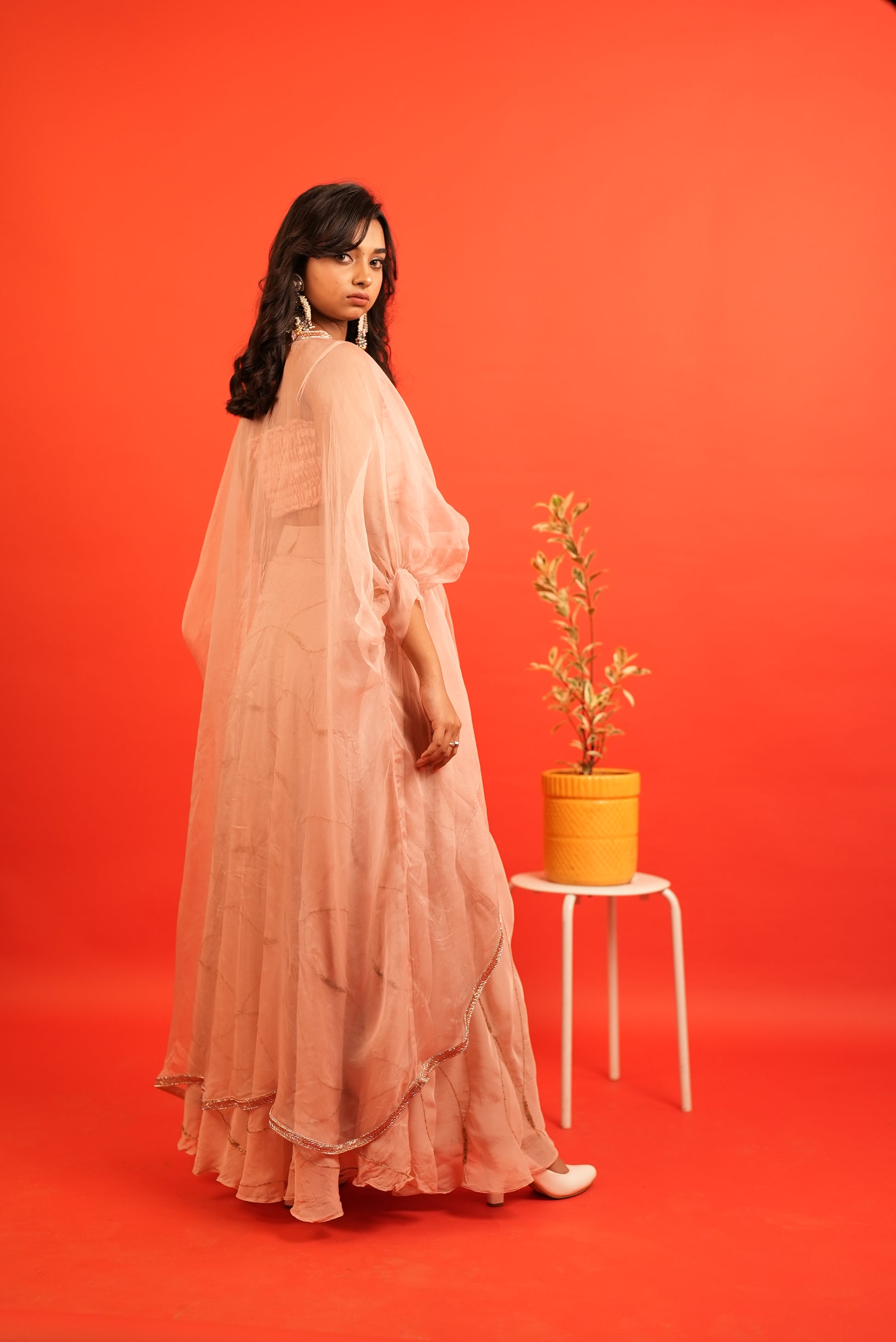 - Viscose Georgette Skirt: The flowing skirt is crafted from elegant viscose georgette, creating a soft, ethereal effect.