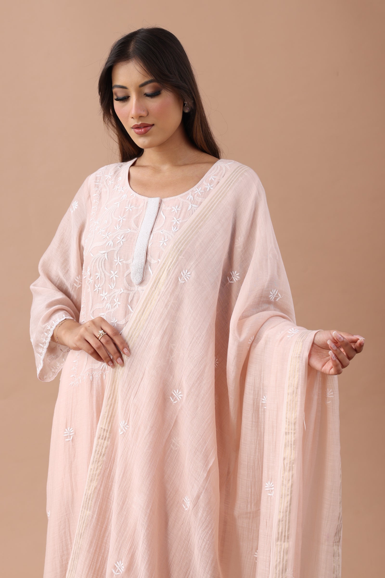 Handloom Mul Chanderi Kurta and Dupatta : Luxurious fabric with intricate thread work and pearls.