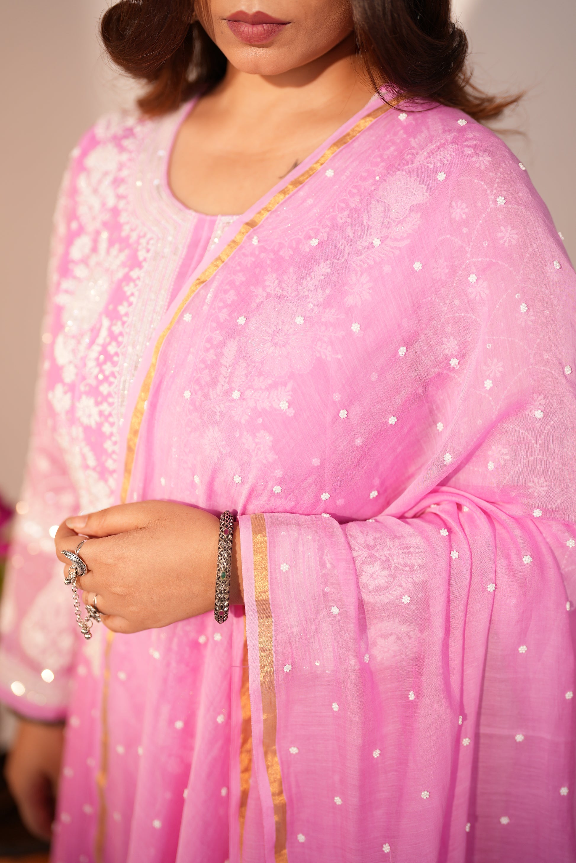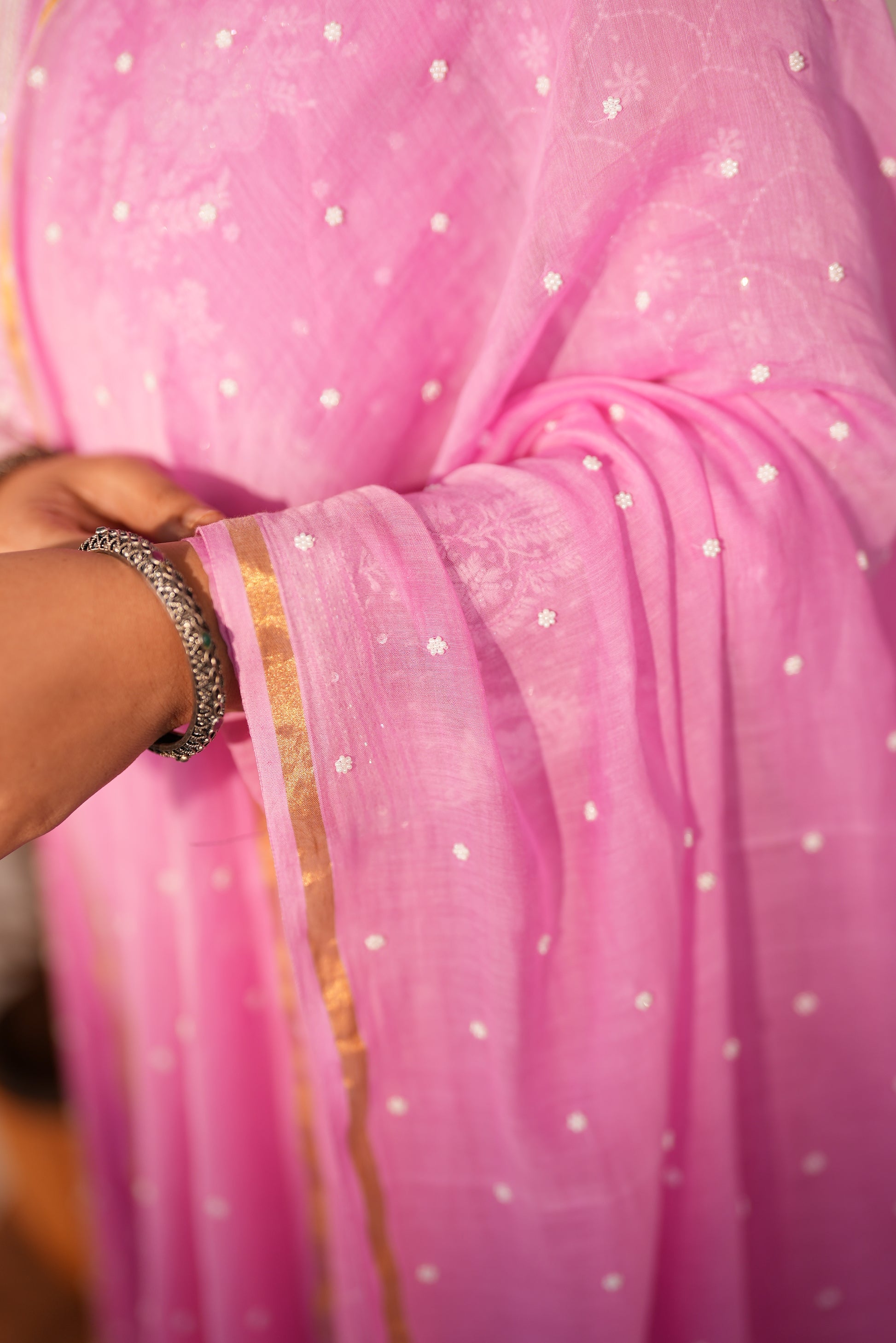 Handloom Mul Chanderi Kurta with Dupatta: Luxurious fabric with intricate terracotta work, highlighted with thread, kutdana, pearls, and sequins.