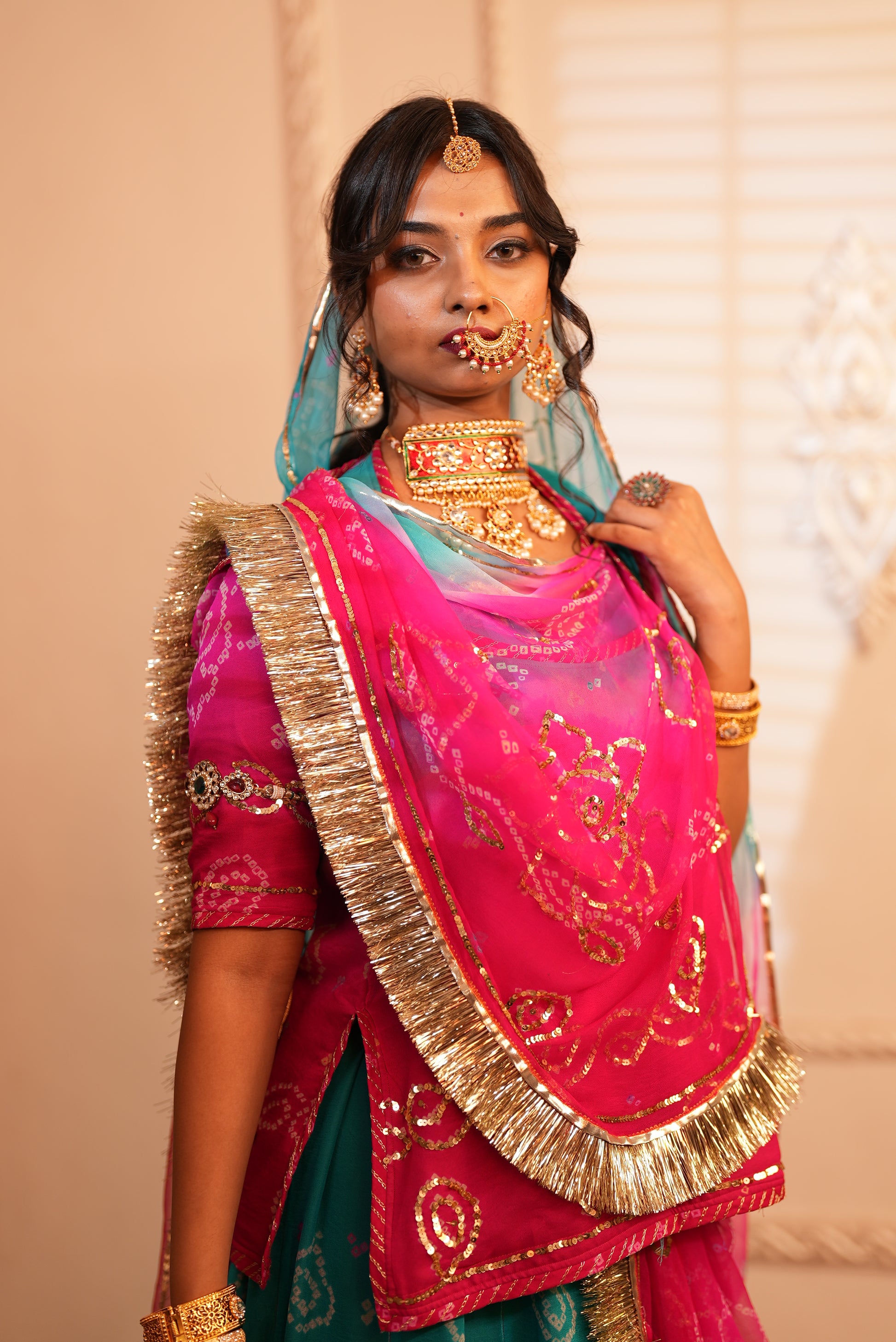These features highlight the Heritage of Rajasthan wirth beauty and craftsmanship of the Pure Chiffon Poshak with Bandhini and Aari -Tari Handwork from Rajasthan