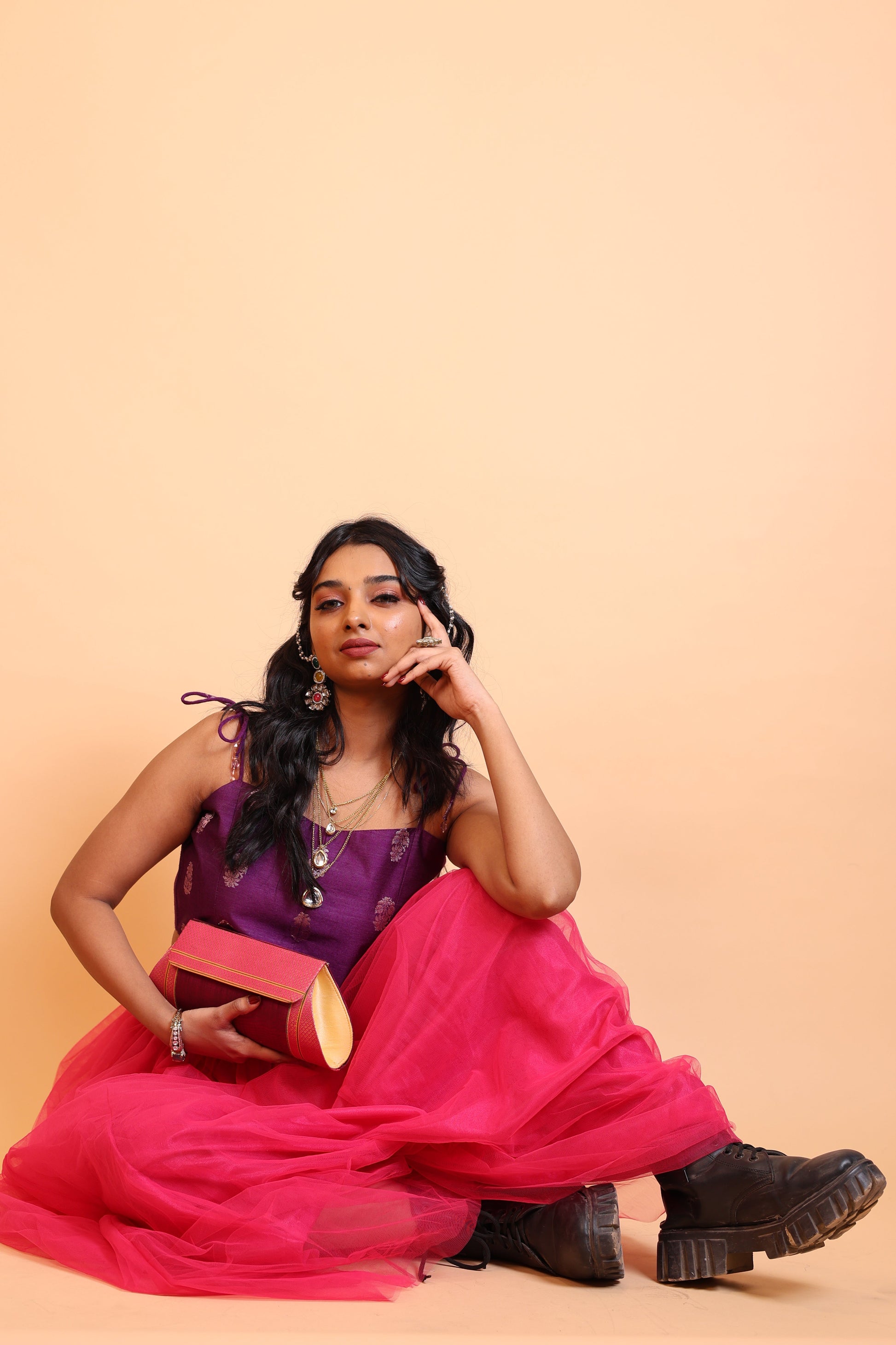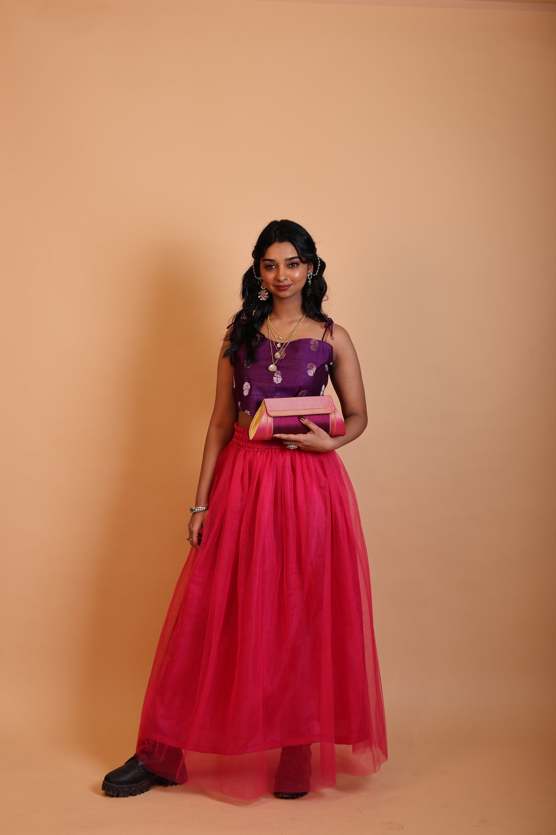 Make a statement with our stunning Vega Skirt and Corset Set, perfect for bohemian chic vibes. The corset is crafted in pure Banarasi brocade, showcasing intricate designs and luxurious texture. Paired with a flowy net skirt, this set exudes elegance and whimsy.