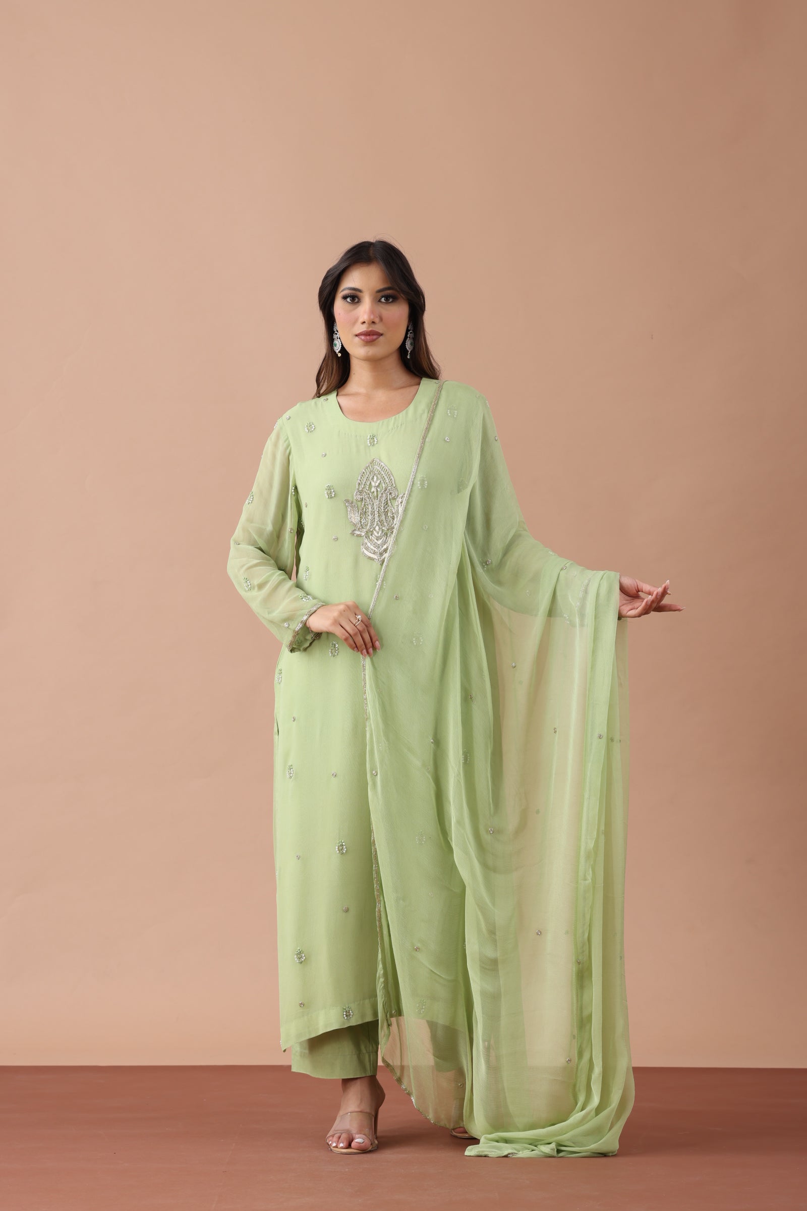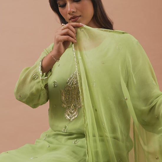 The Zareen Kurta Set includes a georgette kurta, chiffon dupatta, and cotton satin pants. Both the kurta and dupatta feature hand-embroidered zardozi with beads and cut dana in pistachio green.